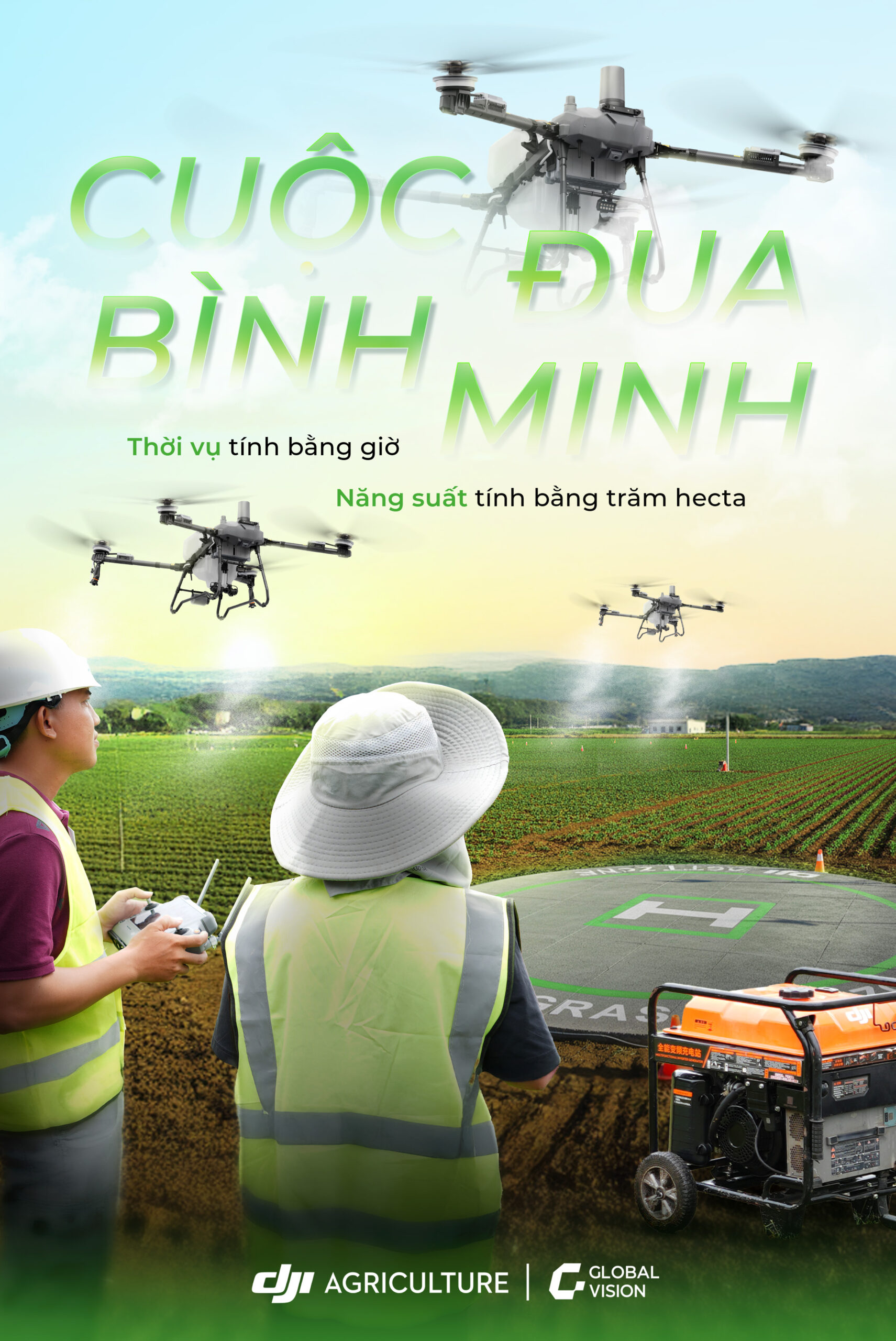 Máy bay nông nghiệp DJI Agras T70P trong chiến dịch quảng cáo Cuộc Đua Bình Minh của Global Vision.