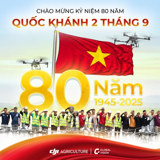Hòa chung không khí hân hoan và tự hào của cả nước đang hướng về Đại lễ Kỷ niệm 80 năm Quốc Khánh Việt Nam (2/9/1945 – 2/9/2025), Global Vision và DJI Agriculture Vietnam xin gửi lời chúc mừng nồng nhiệt nhất đến Quý Đối tác, Quý Khách hàng và toàn thể người dân Việt Nam. 80 năm là một chặng đường lịch sử hào hùng, khẳng định ý chí độc lập và tinh thần vươn lên không ngừng của dân tộc.