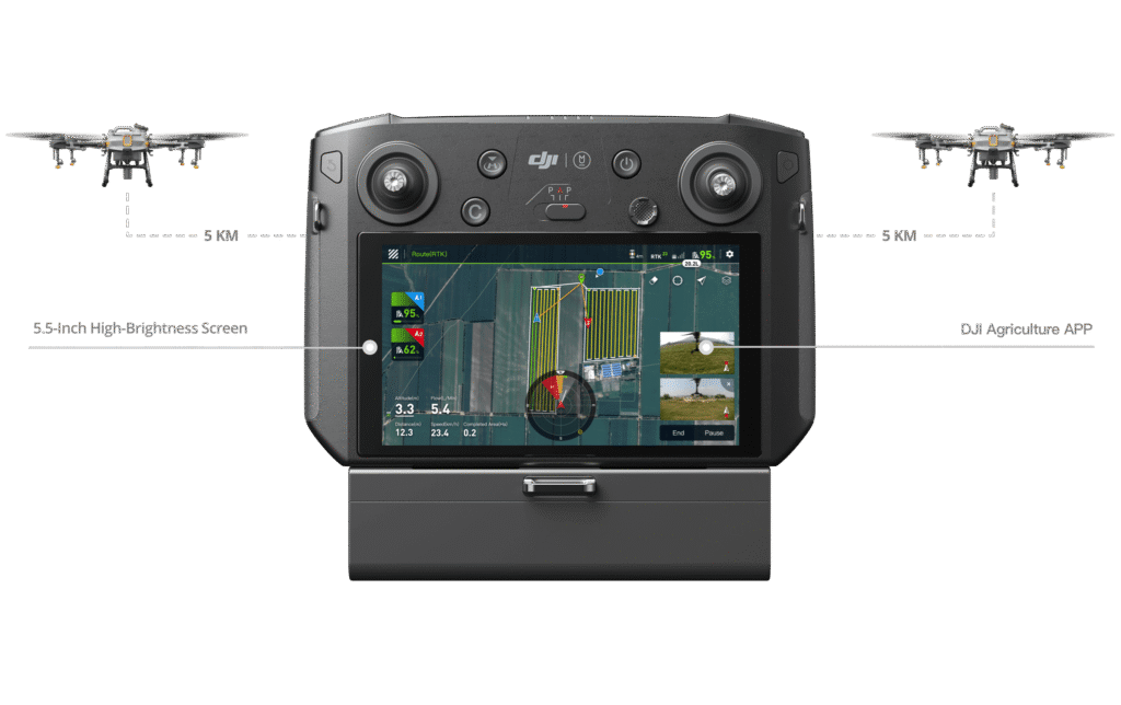 Bộ điều khiển từ xa được cập nhật hỗ trợ truyền hình ảnh ổn định từ khoảng cách lên đến 5 km, nhiều hơn 67% so với thế hệ trước. [3] Màn hình 5,5 inch sáng mang lại hình ảnh rõ nét, ngay cả trong điều kiện ánh sáng khắc nghiệt. Để tăng năng suất, một bộ điều khiển từ xa có thể vận hành nhiều máy bay không người lái cùng một lúc. Mô-đun định vị RTK có độ chính xác cao tùy chọn cho phép lập kế hoạch hoạt động ở cấp độ centimet. Các cải tiến bổ sung bao gồm tín hiệu mạnh hơn, chống nhiễu và ổn định hoạt động. Ứng dụng DJI Agriculture mới mang đến trải nghiệm người dùng mượt mà và hoạt động trực quan hơn.